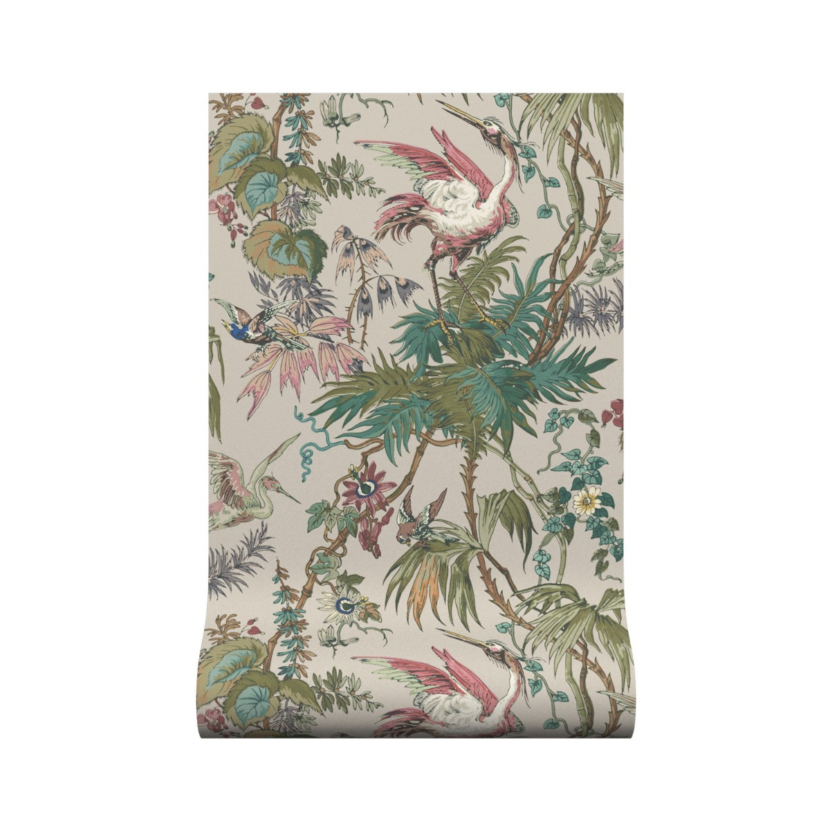 Based on a late 18th century English toile print from Bromley Hall, this meandering tropical floral wallpaper with passion flowers and herons, comes in six glorious colourways.